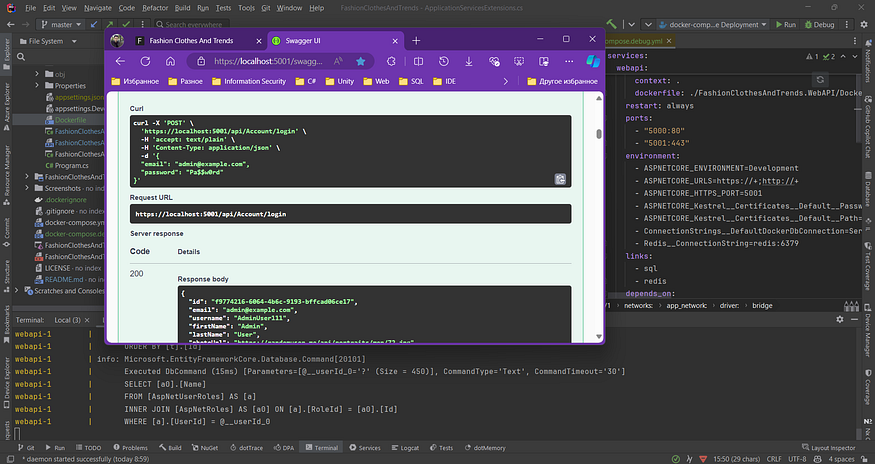• Run the containers: SQL Server, Redis, and your WebAPI will start up in their own isolated containers, and the services will be linked together as defined in the docker-compose.debug.yml file.